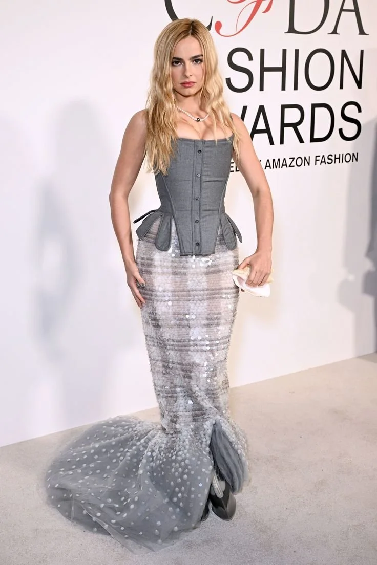 When attending the 2024 CFDA Fashion Awards held in New York, the singer embraced a mermaid-esque custom look by Thom Browne. With a gray corset and a mermaid checkered skirt — not to mention the shell she carried like her bag —, Rae paid tribute to her Aquamarine music persona.